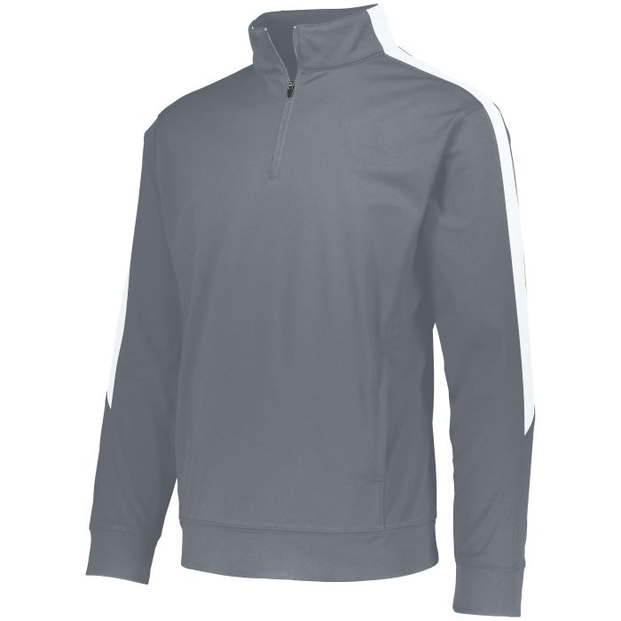 Heavyweight 100% polyester matte brushed tricot * Tag-free label * Quarter zip pullover style * Contrast color inserts * Set-in sleeves * Front pouch pockets * Self-fabric cuffs and bottom band