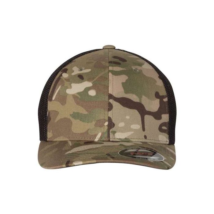 The Flexfit 6511 Trucker Cap features a blend of cotton and polyester for the front panels, with a breathable mesh back made of polyester for ventilation and comfort.