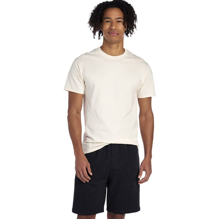 8 oz., 50% cotton, 50% polyester NuBlend? Pre-shrunk Fleece; NuBlend? pill-resistant fleece made with sustainably-sourced, USA-grown cotton ; Three-needle covered elastic waistband with inside drawcord; Side-entry jersey-lined pockets; 9" inseam; Tear-away label