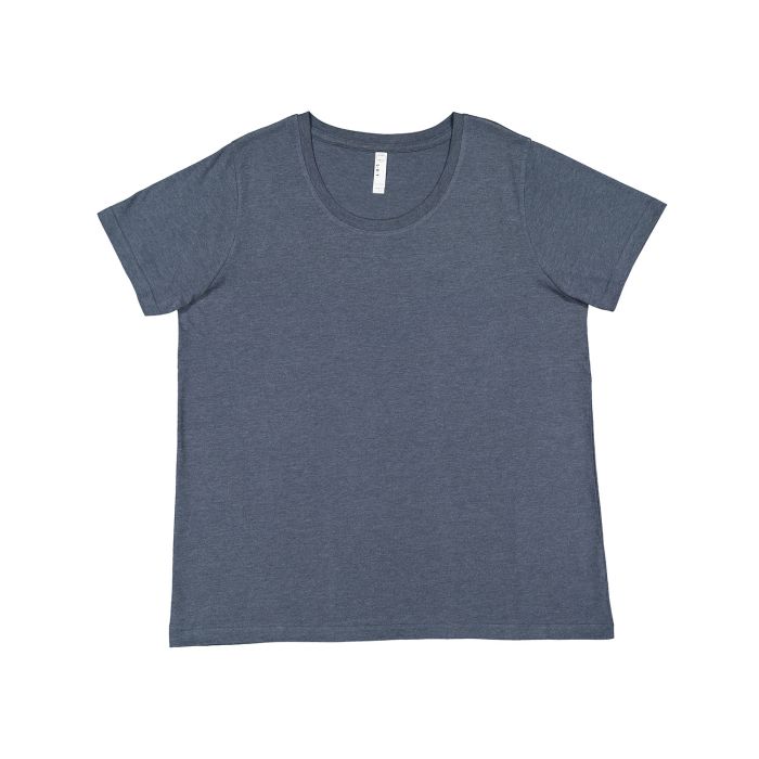 4.5 oz., 60% combed ringspun cotton, 40% polyester fine jersey; Heather: 90% combed ringspun cotton, 10% polyester fine jersey; Natural Heather: 100% combed ringspun cotton fine jersey; Ribbed collar; Self fabric back neck tape; Double-needle sleeves and bottom hem; Side seam construction; Easytear? tear away label; Ladies' curvy, full-figured fit