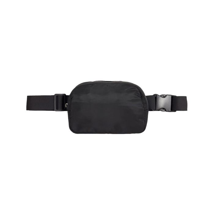 Tight weave polyester material; Main zippered compartment with one large mesh pocket; Two small mesh pockets on opposite side; 43" adjustable strap with a 2" buckle, matching hardware; Easy to transition from waist bag to crossbody bag; Large front area for embellishment; Imprint area 6.5" x 4.5"; Product Size: 7" x 5" x 1.5"; Non-branded label/tag
