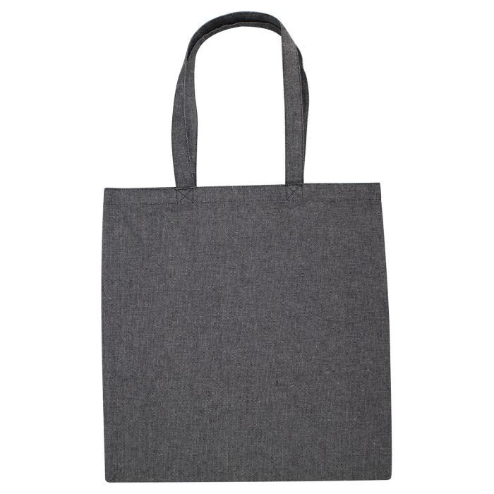 Midweight 100% recycled canvas; Earth-friendly, made of recycled cotton; 15" x 16"; 20" self-fabric handles; Approximate Capacity: 240 cu. in./4L; Non-branded label; Printed label contains fabric content